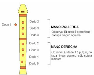 La mano derecha va abajo. El pulgar se pone detrás para sujetar la flauta. El índice, corazón, anular y meñique se ponen en los agujeros que quedan debajo.